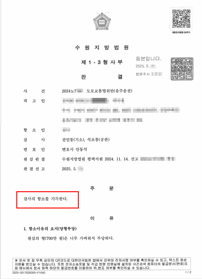 [음주운전 3회/검사항소기각] 음주 3회 1심 벌금형 선고 받은 후 검사의 항소를 재차 기각시킨 사안 , 분당음주운전변호사